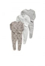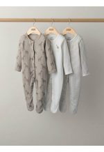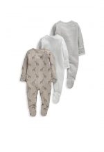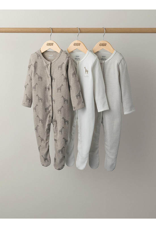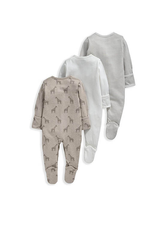 Pack of 3 long sleeve all in one unisex sleepsuits from MAMAS & PAPAS, in three charming designs: oatmeal giraffe print, white stripe print and plain white with giraffe print. Popper fastenings for easy changes and wrap front design with additional concealed popper opening to keep baby extra snug. Integrated scratch mitts up to 9-12 months. Anti-slip soles from size 12-18 months, ideal for little walkers.