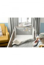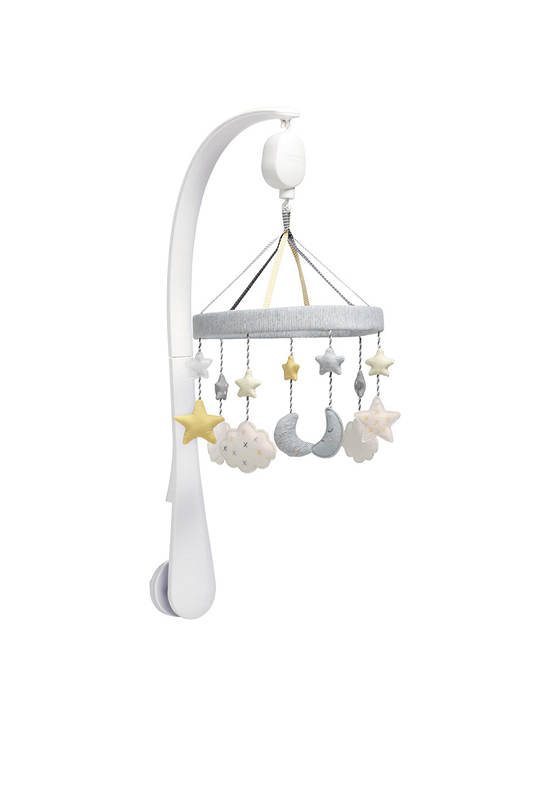 Musical cot mobile. Features hanging felt cloud shapes with embroidered detail. Wind-up music feature plays relaxing lullaby to help soothe baby to sleep. An essential nursery accessory.