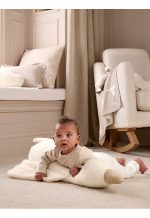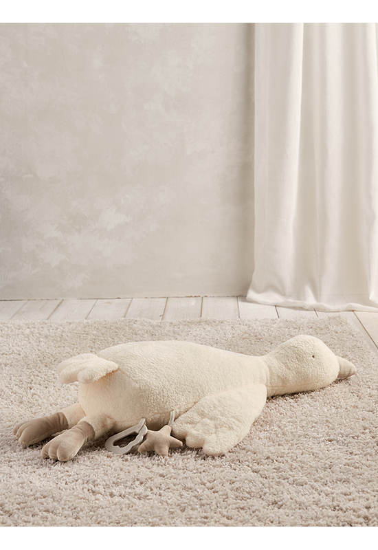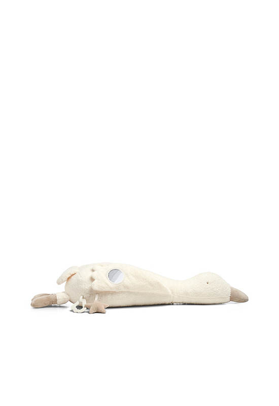 Large duckling ‘tummy time’ toy. With lots of soft padding for baby to use as a support as they start to explore lying on their tummy awake, developing and gaining strength. Our Duckling is made from soft warm fleecy fabric and has handy features so baby can explore their senses, such as crinkle and a rattle. Also includes teether and baby-safe mirror, so they can learn reflections.