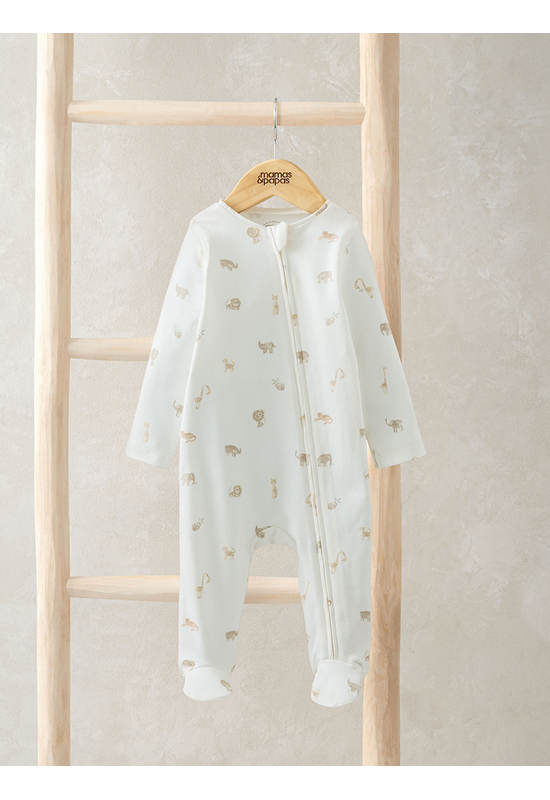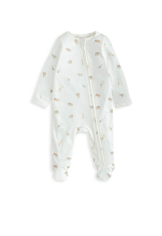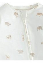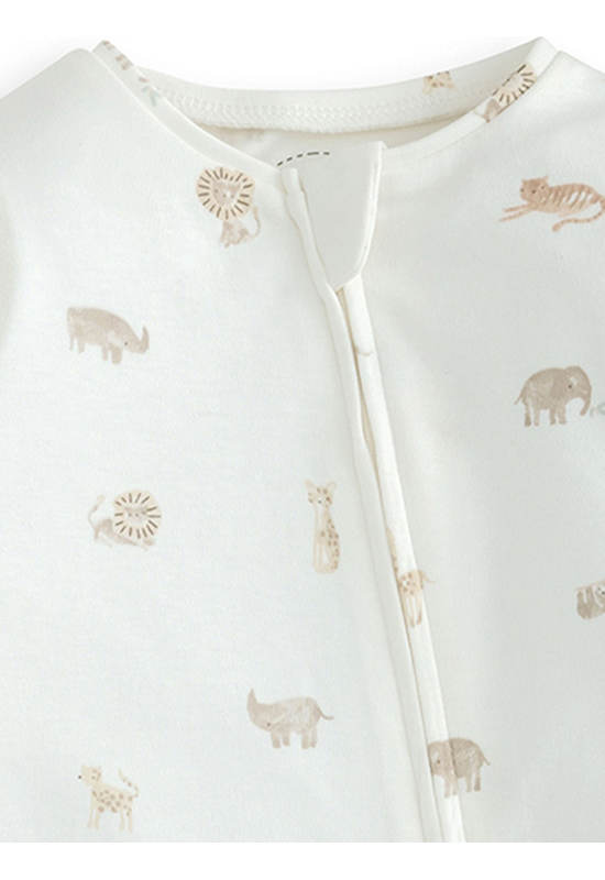 Asymmetric zip-through all-in-one is crafted from supersoft 100% cotton interlock fabric, featuring a fun all-over safari print for a playful yet comfortable style.