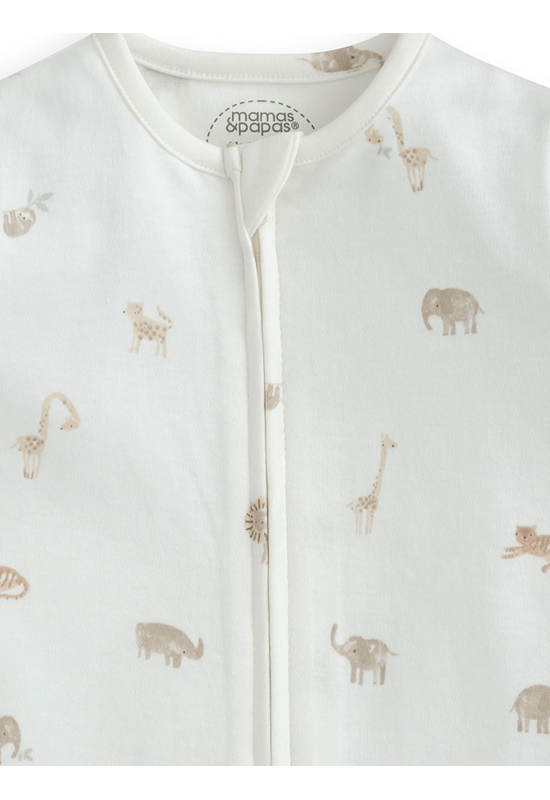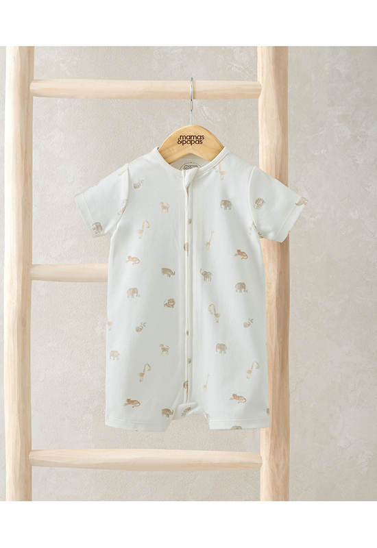 100% soft cotton safari print romper offers comfort and style with a cute safari-themed design and a concealed zip opening for easy dressing.