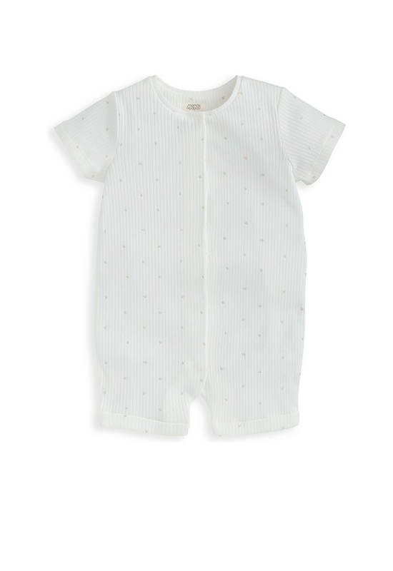 Spot print shortie romper features a cute spotty design, with a zip fastening for easy dressing. It has short sleeves for a comfortable, breezy fit.