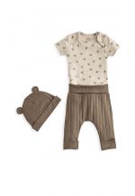 Adorable 100% cotton 3 piece set featuring a bear head print bodysuit, matching leggings and a hat with 3D bear ears.