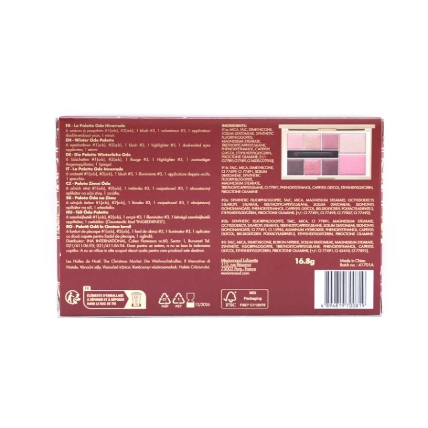 Marionnaud Winter Ode Palette. Enjoy a sweet journey into the heart of winter with the pink and golden shades of this eye and complexion palette. It includes 6 powder eyeshadows (matte, metallic or iridescent finishes), 1 highlighter, 1 blush, 1 double-ended eye applicator and 1 mirror. All the shades in the palette are enhanced by an elegant "dome" effect. The paper used for the case and the wedge comes from sustainably managed forests.