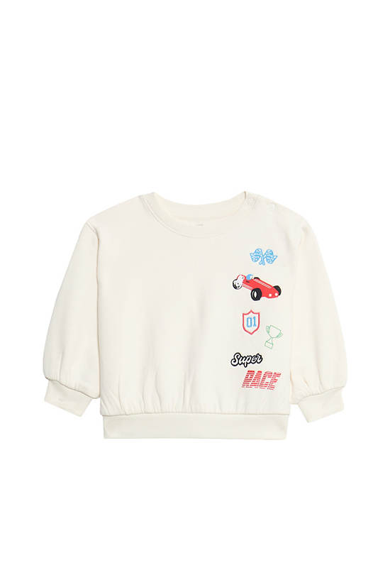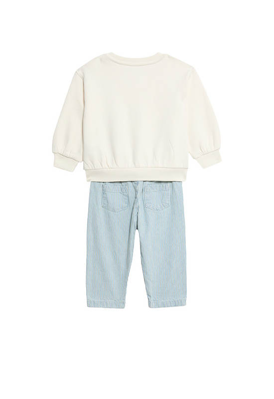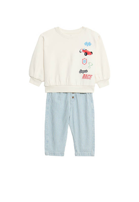 MARKS & SPENCER KIDS This cotton-rich outfit is perfect for playdates. The sweatshirt has racing-themed badges on the front and easy poppers at the shoulder. Striped bottoms have an elasticated waist and button fastenings to help with changing.