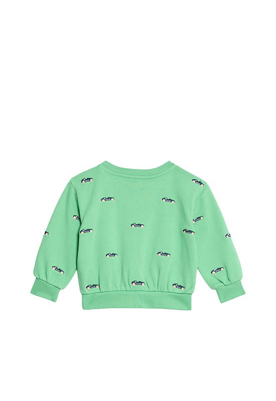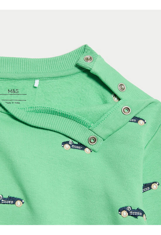 MARKS & SPENCER KIDS This sweatshirt made from soft pure cotton will make a cute addition to your little one’s wardrobe. The popper fastenings on the shoulder ensure changes are swift and fuss-free. Snug ribbed trims at the round neck, hem and cuffs fit snugly. The all-over embroidered car motif gives this versatile piece a fun finish.