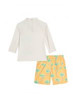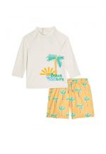 MARKS & SPENCER KIDS This two-piece swim set is a perfect choice for days in the water. Comfy regular fit, with added stretch for easy movement. The rash vest has three-quarter sleeves for coverage, and fastens with a zip at the back of the neck. An all-over palm print lends a cheerful look to the elasticated shorts, while a drawcord tie holds everything in place.