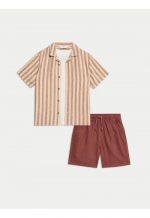 Get them ready for sunny days with this three-piece outfit from MARKS&SPENCER. The short-sleeved shirt and shorts are crafted from linen-rich fabric in a regular fit, with a smart collared neckline and a comfy drawstring waist. The set also includes a pure cotton t-shirt.