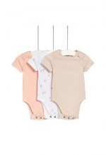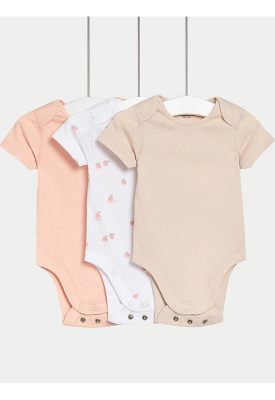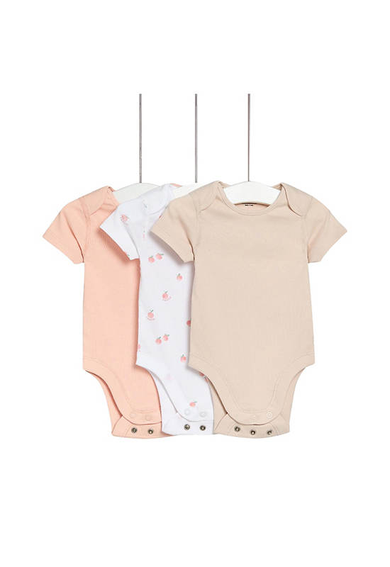 These pure cotton bodysuits from MARKS&SPENCER are perfect for your little one. Short-sleeved style, with wide necklines and practical popper fastenings. Flat seams feel gentle on delicate skin. Three-pack includes two plain designs and one with an all-over print of peaches.
