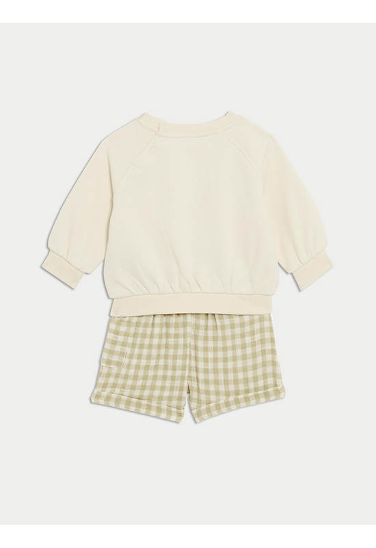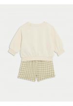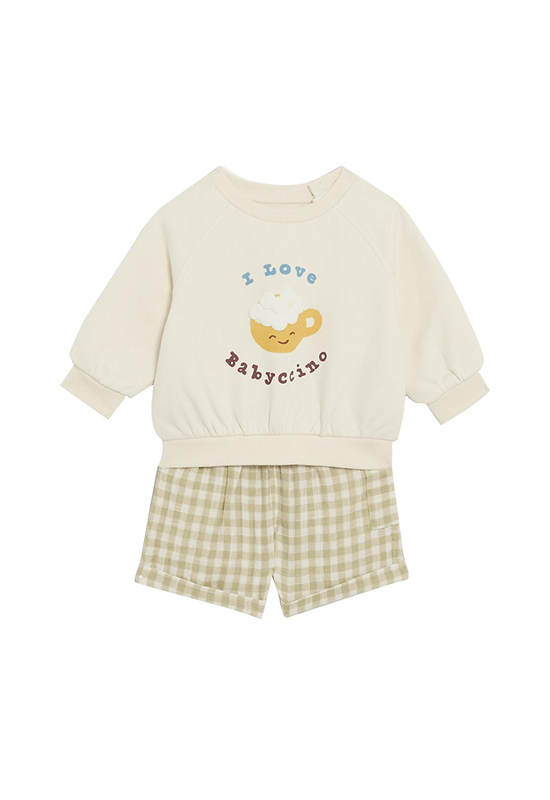 This cosy cotton-rich outfit from MARKS&SPENCER is perfect for baby’s fun playdates. The long-sleeved sweatshirt has a sweet pocket on the front and a cute ‘I love Babyccino’ print. Poppers at the back make dressing easier. The shorts have a lightweight weave, a classic checked pattern and a side pocket.