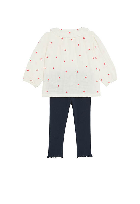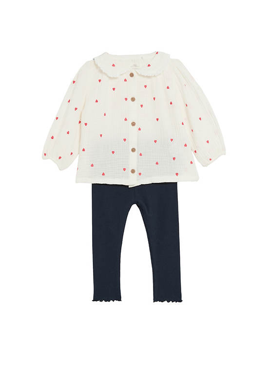 MARKS & SPENCER KIDS This cotton-rich outfit is perfect for playtime. Two-piece set includes a long-sleeved blouse with a sweet Peter Pan collar and heart embroidery all over. It buttons through the front for easy dressing. Paired with cosy leggings featuring an elasticated waist for comfort.