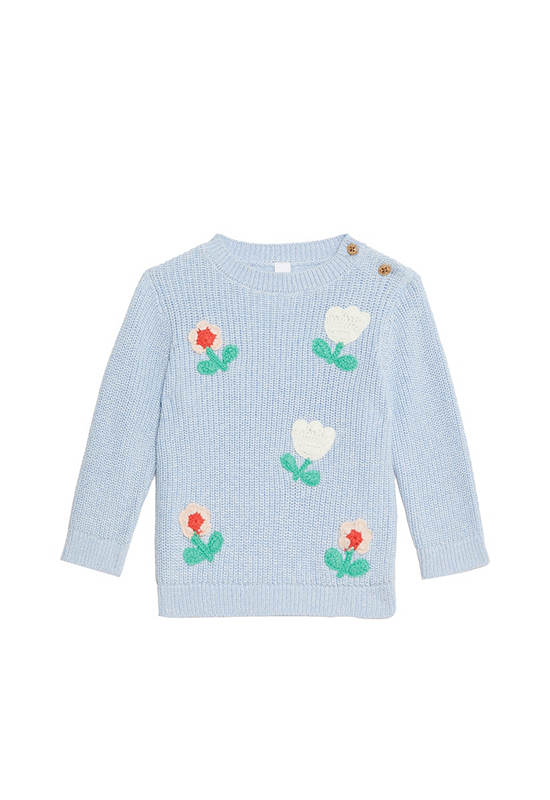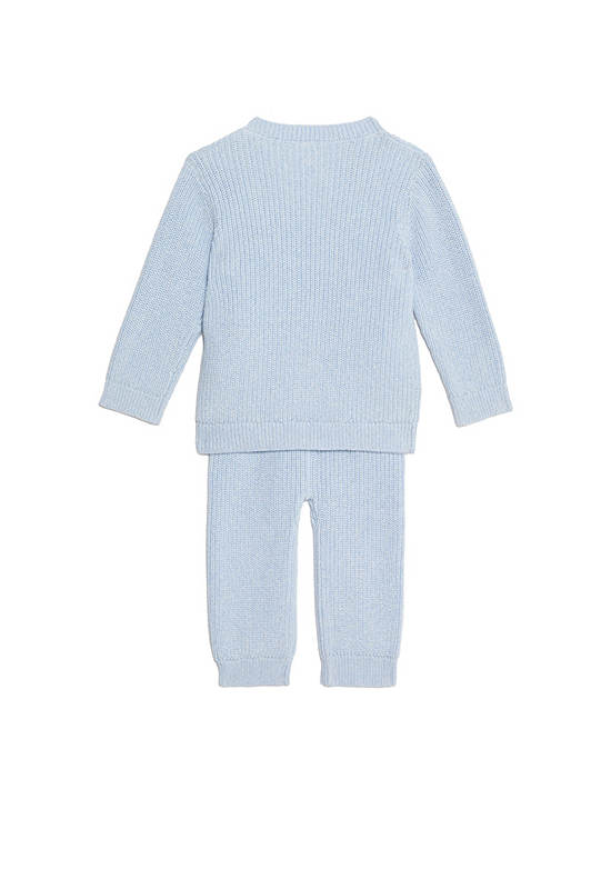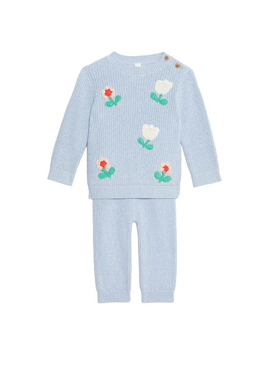 MARKS & SPENCER KIDS This adorable two-piece outfit is knitted from soft and breathable pure cotton. It pairs a long-sleeved top with pull-on leggings. Buttons at one shoulder make dressing easier, while an elasticated waist gives a flexible fit. Knitted flowers stitched to the top add a charming finish.