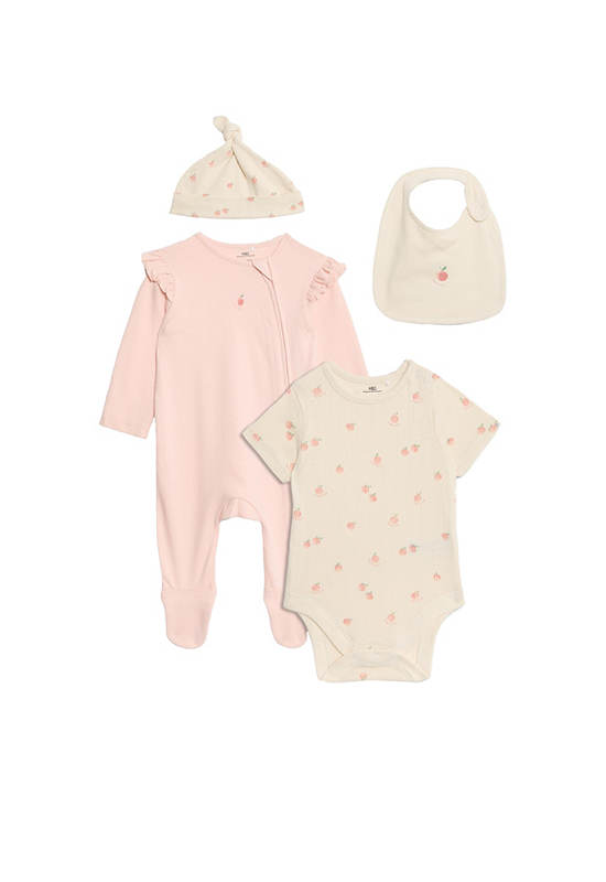 This four-piece starter set from MARKS&SPENCER is a peachy gift for new arrivals. Includes a ribbed bodysuit and a zipped sleepsuit with Babysafe toes and integral mitts on sizes up to 6 months. Cosy flat seams. Complete with a matching hat and bib.