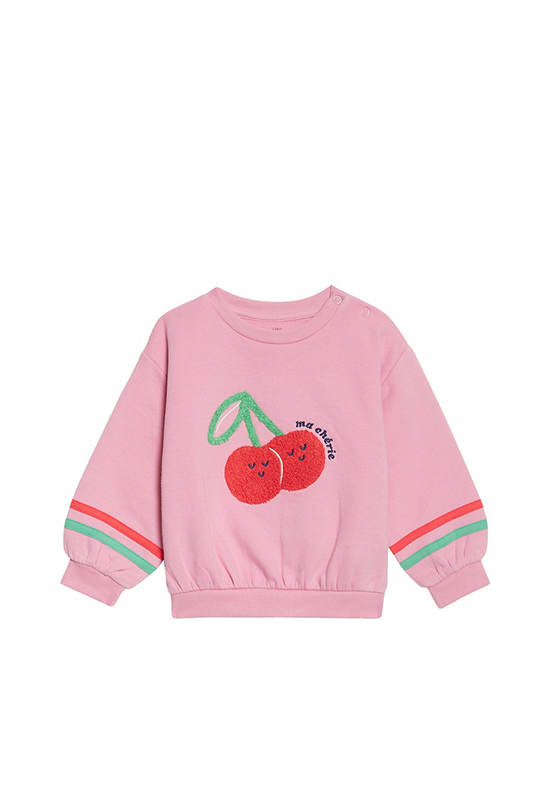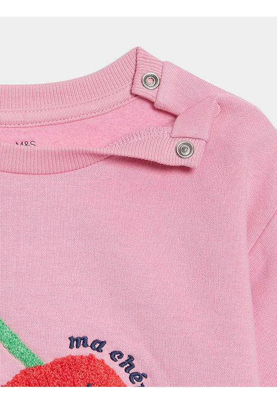 MARKS & SPENCER KIDS Bring a splash of colour to their wardrobe with this bright, cotton-rich sweatshirt. The round-neck style is designed with stretchy ribbed trims and long blouson sleeves. Popper fastenings at the shoulder make dressing easier. On the front, tactile boucle embroidery depicts two smiling cherries.