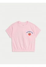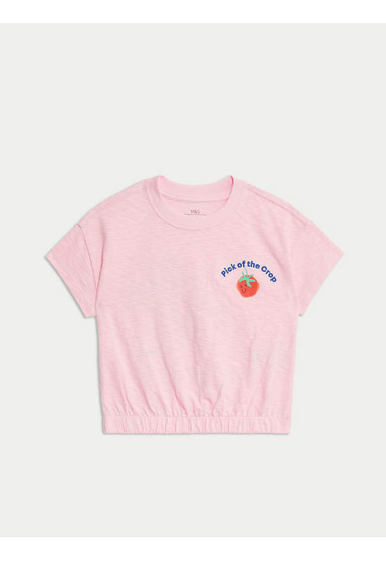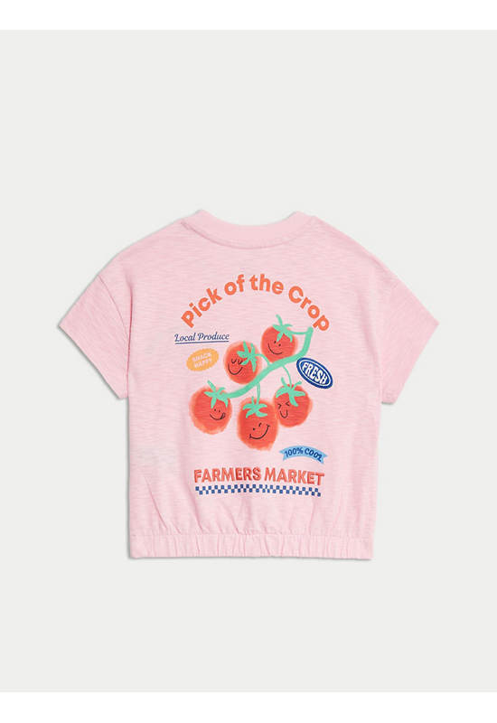 Freshen up their wardrobe with this fun pure cotton t-shirt from MARKS&SPENCER. Comfy regular fit. The chest features a smiling tomato graphic with embroidered slogan ‘Pick of the crop’. The back has a larger tomatoes graphic with slogans including ‘Farmers market’ and ‘100% cool’.