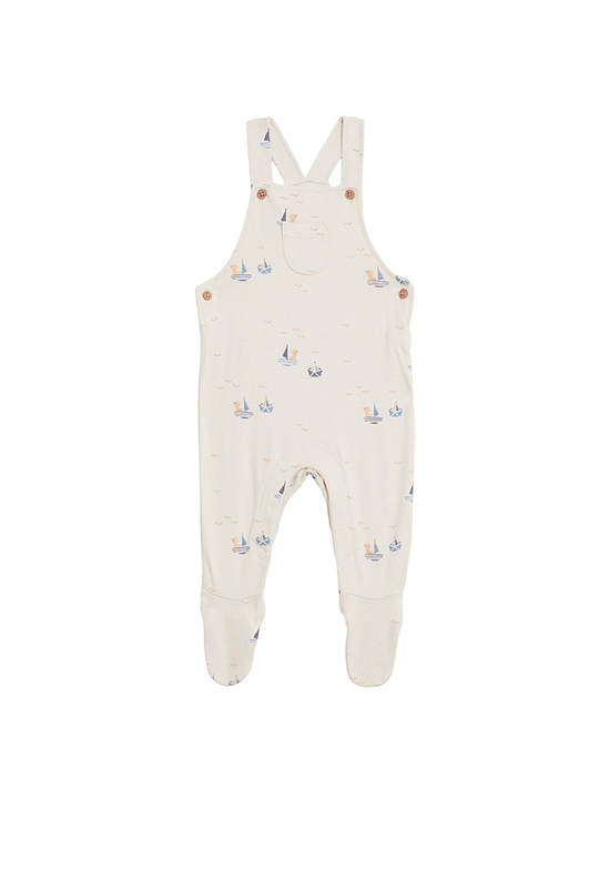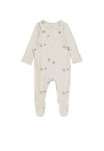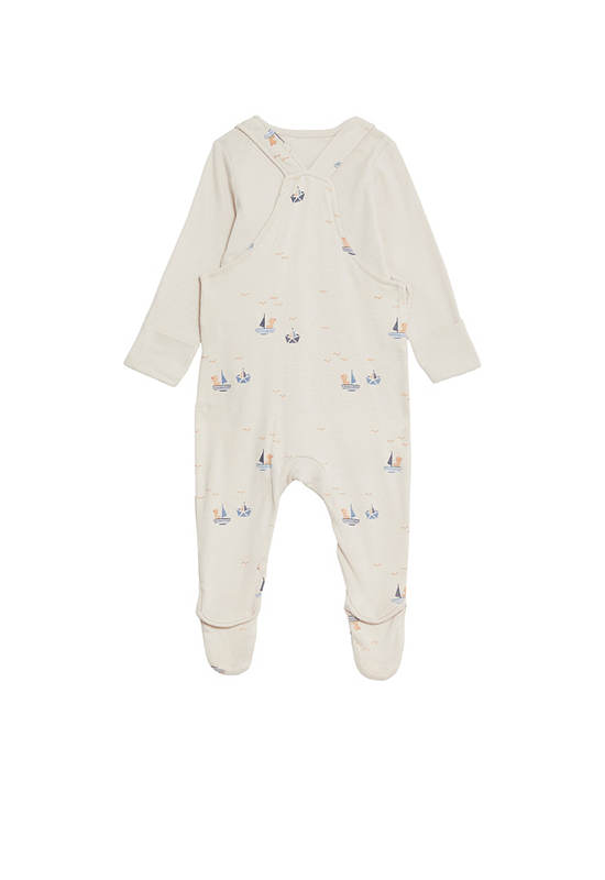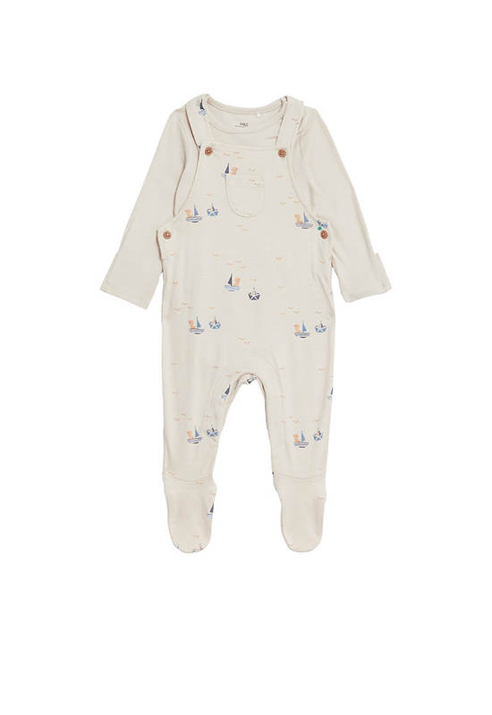 MARKS & SPENCER KIDS This two-piece cotton outfit is perfect for playtime. The long-sleeved bodysuit has integral scratch mitts, flat seams and popper fastening on gusset. Over the top, the boat print dungarees are complete with Babysafe toes, anti-slip technology and adjustable strap fastening.