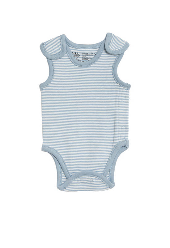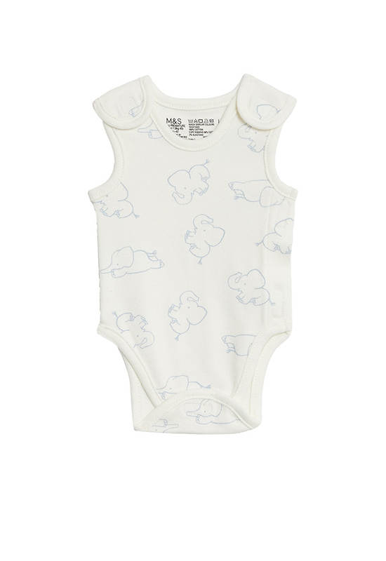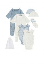 MARKS & SPENCER KIDS This pure cotton starter set is perfect for premature newborns. Includes two sleepsuits, two sleeveless bodysuits, two hats and two sets of mittens all featuring stripes or sweet elephants. Riptape fastenings on the sleepsuits and bodysuits make for super simple changing. A handy drawstring bag keeps everything together.