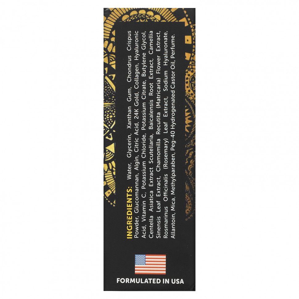 Вода, глицерин, ксантановая камедь, порошок из ирландского мха (Chondrus crispus), глюкоманнан, альгин, лимонная кислота, Золото 24K, коллаген., Гиалуроновая кислота, витамина C, хлорид калия, цитрат калия, бутиленгликоль, экстракт центеллы азиатской (Centella asiatica), экстракт корня байкальского (baicalensis), экстракт листьев зеленого чая (Camellia sinensis), экстракт цветков ромашки (Chamomilla recutita), экстракт листьев розмарина (Rosmarinus officinalis), гиалуронат натрия, аллантоин, слюду, метилпарабен, ПЭГ-40 гидрогенизированное касторовое масло, парфюмерная композиция.
