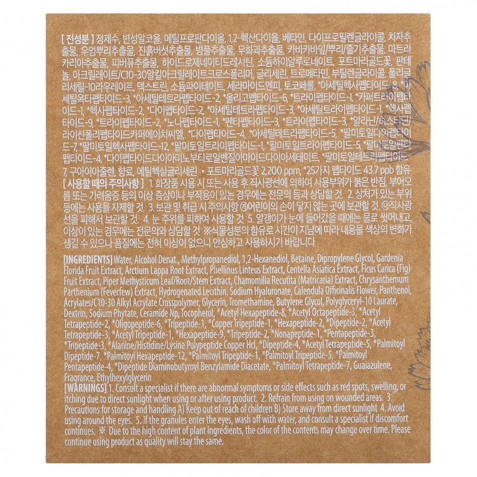 Вода, спирт денат., метилпропандиол, 1,2-гександиол, бетаин, дипропиленгликоль, экстракт плодов гардении жасминовидной (Gardenia florida), экстракт корня лопуха (Arctium lappa), экстракт санхвана (Phellinus linteus), экстракт готу колы (Centella asiatica), экстракт плодов инжира (Ficus carica), экстракт листьев/корней/стеблей перца опьяняющего (Piper methysticum), экстракт ромашки лекарственной (Chamomilla recutita), экстракт пиретрума девичьего (Chrysanthemum parthenium), гидрогенизированный лецитин, гиалуронат натрия, цветки календулы (Calendula officinalis), пантенол, акрилат/c10-30 алкил акрилат кроссполимер, глицерин, трометамин, бутиленгликоль, полиглицерил-10 лаурат, декстрин, фитат натрия, керамид NP, токоферол, ацетил гексапептид-8, ацетил октапептид-3, ацетил тетрапептид-2, олигопептид-6, трипептид-1, трипептид меди-1, гексапептид-2, дипептид-2, ацетил тетрапептид-3, ацетил трипептид-1, гексапептид-9, трипептид-2, нонапептид-1, пентапептид-3, трипептид-3, аланин / гистидин / лизин, полипептид, медь, гидрохлорид, дипептид-4, ацетил тетрапептид-5, пальмитоил дипептид-7, пальмитоил гексапептид-12, пальмитоил трипептид-1, пальмитоил трипептид-5, пальмитоил пентапептид-4, дипептид диаминобутироил бензиламид диацетат, пальмитоил тетрапептид-7, гвайазулен, отдушка, этилгексилглицерин.