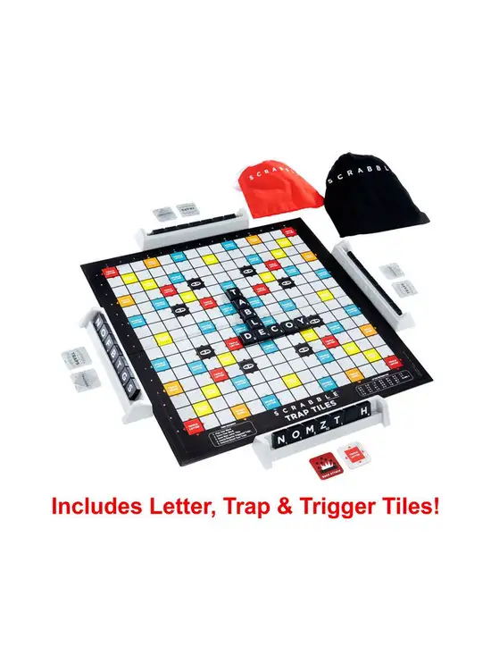 Toys from MATTEL Lay hidden traps to sabotage opponents in this new way to play the classic spelling game with Scrabble Trap Tiles game. This word-tile game gets an explosive twist with the addition of Trigger and Trap Tiles that set off special abilities like stealing points or removing tiles, giving clever players an advantage. Build words to score points but beware the premium squares! A trap may have been set there, turning the game on its head. This Scrabble game changes with every trap that is set off!