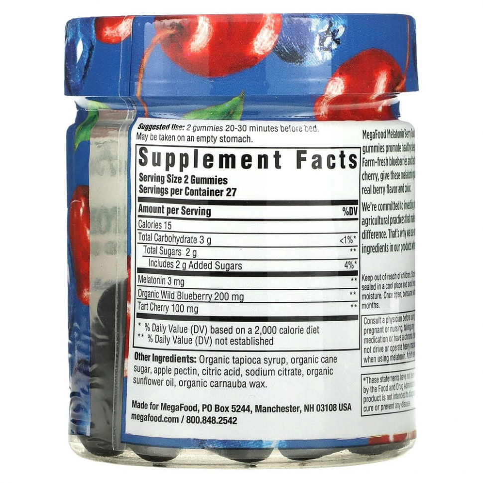 Жевательные конфеты с мелатонином MegaFood Melatonin Berry Good Sleep® способствуют здоровому циклу сна. Выращенная на ферме свежая голубика и вкусная вишня придают этим жевательным конфетам с мелатонином настоящий ягодный вкус и цвет.