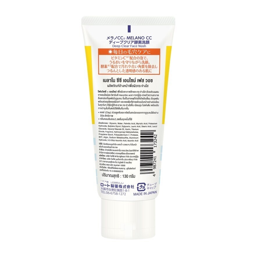 Melano CC Enzyme Face Wash Vitamin C + Enzyme foam for deep clean and clear skin. With a mixture of enzyme and Ascorbic acid from Japan, helps to clean the dirt that clogs the pores which is the cause of pimples, clogged pores and helps to gently exfoliate old skin cells, dead skin cells on the face every day make skin feel clean, more radiant, smooth, soft, not dry and tight, ready to receive the next step of nourishment. — Clay helps absorb and remove dirt from the pores effectively. — Light citrus scent felling fresh every time you use