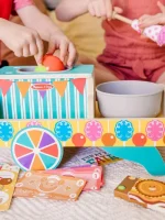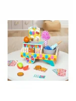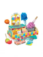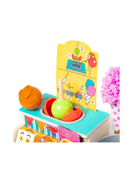 Create pretend play cotton candy and candied apples that can be displayed along with wooden candy bars and peanuts in a sturdy wooden tabletop cart. Includes wooden peanut butter cups in a box, wooden chocolate bar in a box, dipping bowl for candy apples an spinning bowl for cotton candy, reusable activity cards, 10 play money bills. A fun way to learn colors, sorting, problem-solving, and fine motor skills. From games of skill and chance to innovative carnival-inspired play sets, the Melissa & Doug Fun at the Fair!™ collection brings home all the fun of a day at the fair. Makes a great gift for preschoolers, ages 3 to 5, for hands-on, screen-free play