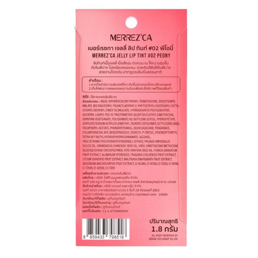 MERREZ’CA JELLY LIP TINT 02 PEONY Jelly-textured lip tint, densely colored, long-lasting, and moisturizing. On the lips, not sticky. Helps add color to the lips Outstandingly beautiful The lips look plump and natural. MERREZ’CA Jelly Lip Tint with 2 vibrant colors to choose Merrez’Ca Jelly Lip Tint 01 Poppy, Merrez’Ca Jelly Lip Tint 02 Peony. 1. If after use there is any abnormality. occurs, must stop using and consult a doctor. 2. Keep away from sunlight and heat for good product performance. How to use: Apply to decorate the lips.