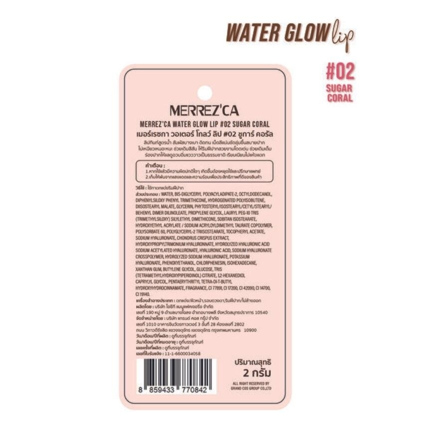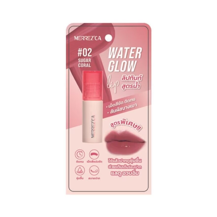 Water-based lip tint, clear color, long lasting, light touch. Moisturize all day long. Merrezca Water Glow Lip Color 02 Sugar Coral is a light, moisturizing lip tint. Gives a plump, shiny finish. With the feature of leaving a clear, long-lasting color stain. Rich in vitamin E that helps add moisture to the lips. For lips that are plump, smooth, soft to the touch, as well as nourishing the lips to be healthy with 8 types of Hyaluronic and protecting against water loss, light and comfortable, not sticky. Lip helps add moisture to the lips. Provides a soft, smooth, light touch that fills the grooves of the mouth, making it look plump and healthy. The pigment is clear, covering the lip color completely, and lasting all day. Contains 8 types of low and high molecular hyaluronic acid to help maintain and replenish moisture to the lips. Makes the lips look healthy and moisturized all day long. The lip texture is a very thin hydration film. Makes it absorb into the skin better and deeper. Sticks to the lips well and reduces wrinkles. Stimulates collagen synthesis