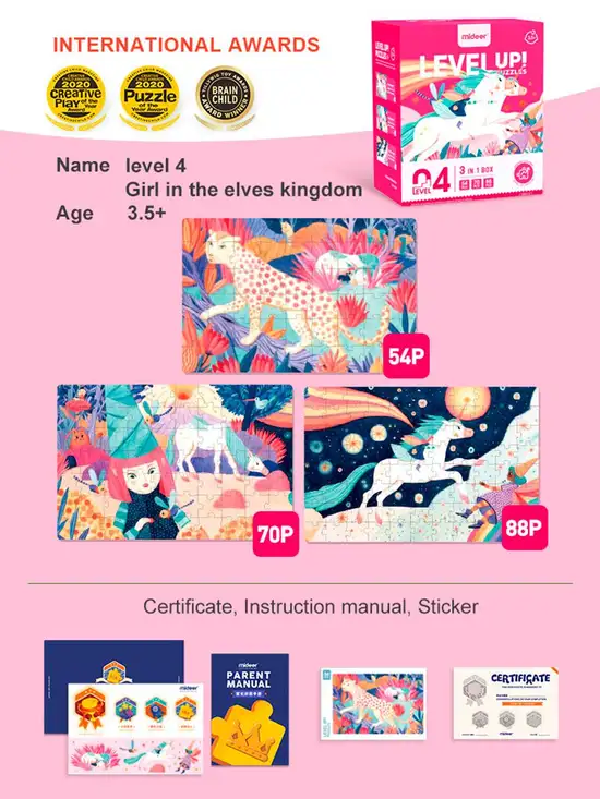 Level Up! Puzzle -Level 4 Unicorn from MIDEER brand. Unicorn fans must have. This can’t be missed! enhance learning development With age level jigsaw puzzles Level Up! With new cute patterns, great value with 3 patterns in 1 box, don’t wait!