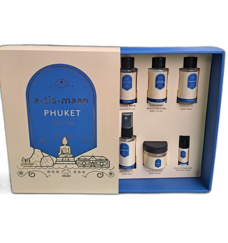 В мини-набор для Спа процедуры входит шесть продуктов для тела: Увлажняющее и питающее кожу молочко 30 гр, успокаивающий лосьон для тела 30 гр, Средство для мытья тела 30 гр, Ароматический спрей для тела 30 гр, скраб для тела 30 гр и смягчающий крем локального действия 5 гр.