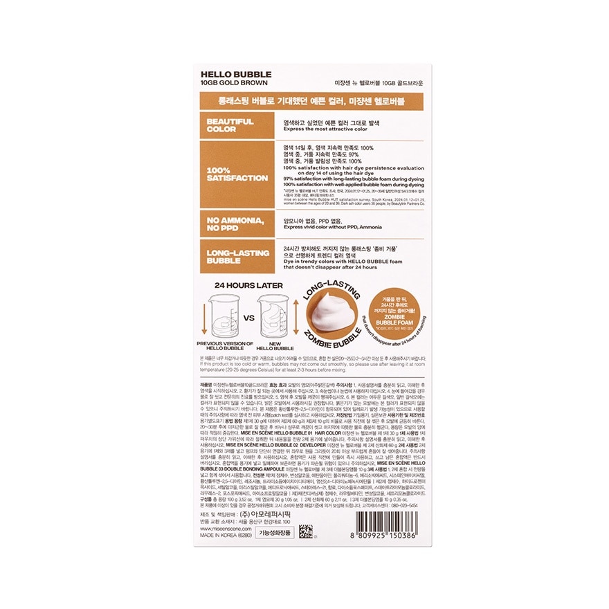 UNBELIEBUBBLE LONG LASTING COLOR Koreas No.1 HELLO BUBBLE hair colorant series has been upgraded Together with the new generation girl group — aespa, lets express the most attractive and vivid hair color, create the perfect hair style, and lead a new trend in hair dyeing. Presented in a total of 19 colors that contain the bright and bouncy charm of aespa by expanding the range of customer choices with a diverse color spectrum from toned-down to medium, vivid, and light. — New upgraded Zombie Bubble formula with finer and long-lasting bubble that doesnt disppear after 24 hours of foaming to revealing richer and more vivid trendy hair color. — 100% satisfaction with hair dye persistence evaluation after using the hair dye on day 14. — 97% satisfaction with long lasting bubble foam during dyeing. — 97% satisfaction with well applied bubble foam during dyeing. — Contains Double Bonding Ampoule to improve hair repair ability when dyeing. Maintain the smoothness and shinniness of hair. — No am.