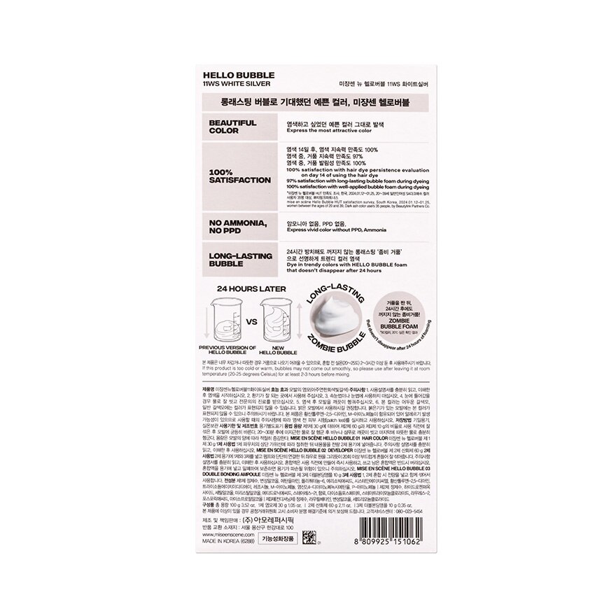 UNBELIEBUBBLE LONG LASTING COLOR Koreas No.1 HELLO BUBBLE hair colorant series has been upgraded Together with the new generation girl group — aespa, lets express the most attractive and vivid hair color, create the perfect hair style, and lead a new trend in hair dyeing. Presented in a total of 19 colors that contain the bright and bouncy charm of aespa by expanding the range of customer choices with a diverse color spectrum from toned-down to medium, vivid, and light. — New upgraded Zombie Bubble formula with finer and long-lasting bubble that doesnt disppear after 24 hours of foaming to revealing richer and more vivid trendy hair color. — 100% satisfaction with hair dye persistence evaluation after using the hair dye on day 14. — 97% satisfaction with long lasting bubble foam during dyeing. — 97% satisfaction with well applied bubble foam during dyeing. — Contains Double Bonding Ampoule to improve hair repair ability when dyeing. Maintain the smoothness and shinniness of hair. — No am.