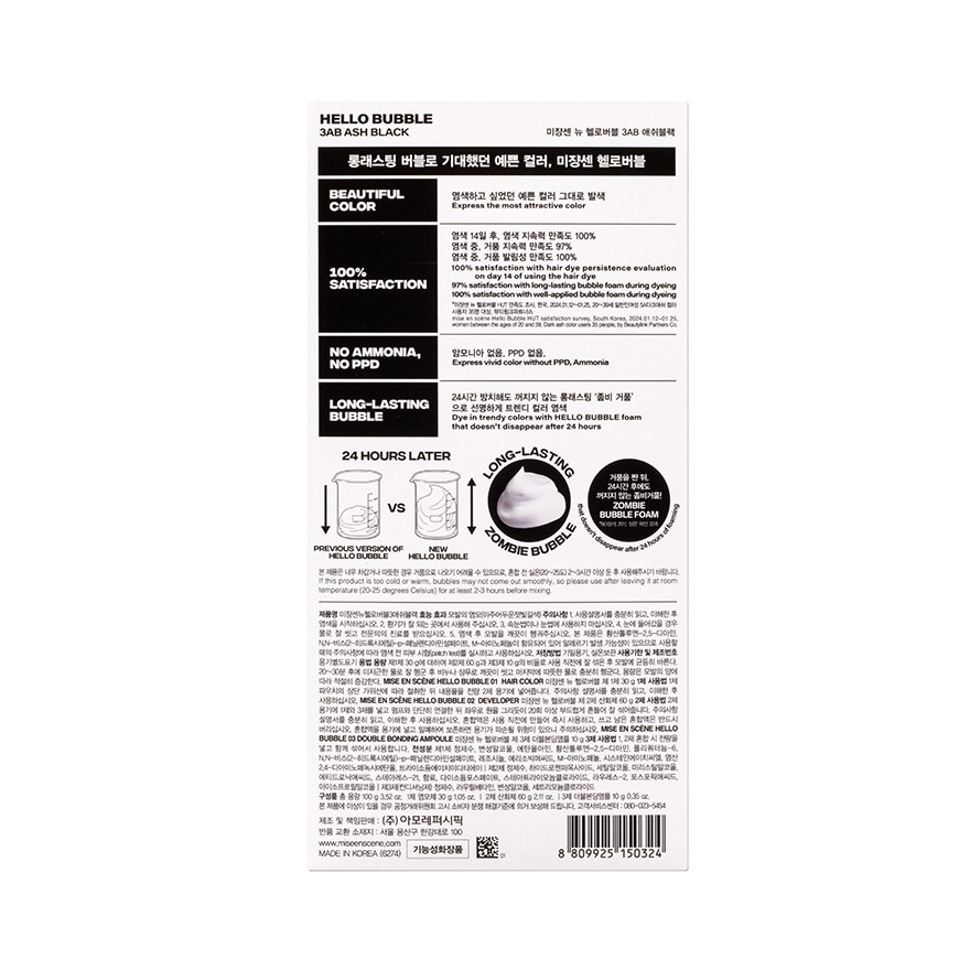 UNBELIEBUBBLE LONG LASTING COLOR Koreas No.1 HELLO BUBBLE hair colorant series has been upgraded Together with the new generation girl group — aespa, lets express the most attractive and vivid hair color, create the perfect hair style, and lead a new trend in hair dyeing. Presented in a total of 19 colors that contain the bright and bouncy charm of aespa by expanding the range of customer choices with a diverse color spectrum from toned-down to medium, vivid, and light. — New upgraded Zombie Bubble formula with finer and long-lasting bubble that doesnt disppear after 24 hours of foaming to revealing richer and more vivid trendy hair color. — 100% satisfaction with hair dye persistence evaluation after using the hair dye on day 14. — 97% satisfaction with long lasting bubble foam during dyeing. — 97% satisfaction with well applied bubble foam during dyeing. — Contains Double Bonding Ampoule to improve hair repair ability when dyeing. Maintain the smoothness and shinniness of hair. — No am.