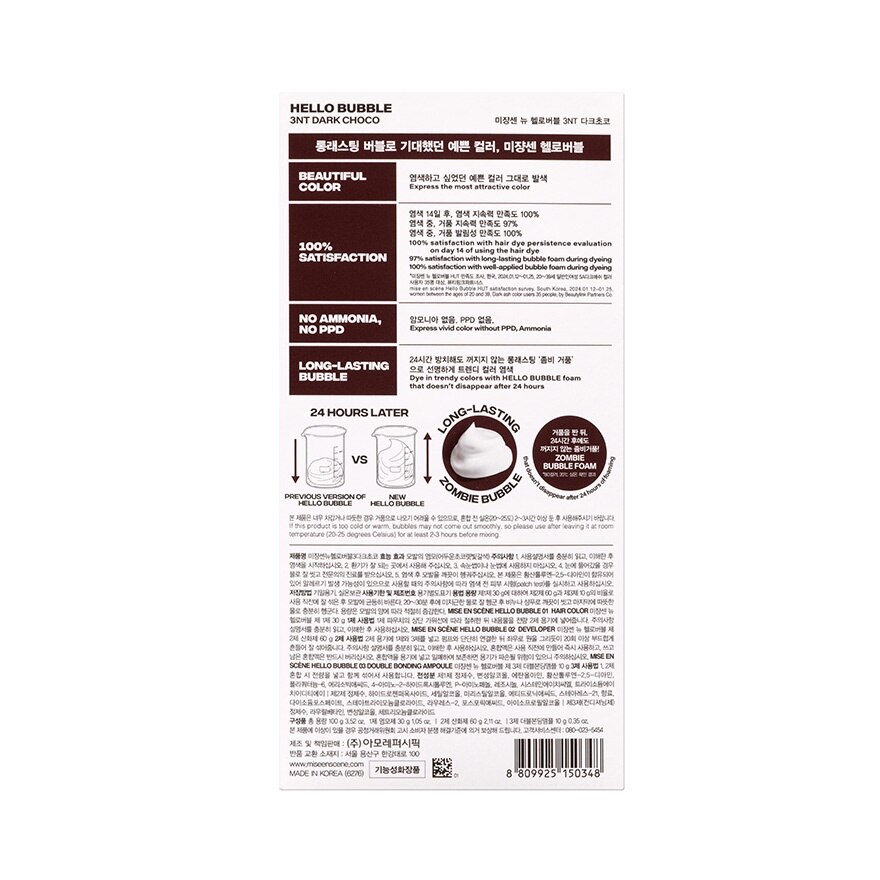 UNBELIEBUBBLE LONG LASTING COLOR Koreas No.1 HELLO BUBBLE hair colorant series has been upgraded Together with the new generation girl group — aespa, lets express the most attractive and vivid hair color, create the perfect hair style, and lead a new trend in hair dyeing. Presented in a total of 19 colors that contain the bright and bouncy charm of aespa by expanding the range of customer choices with a diverse color spectrum from toned-down to medium, vivid, and light. — New upgraded Zombie Bubble formula with finer and long-lasting bubble that doesnt disppear after 24 hours of foaming to revealing richer and more vivid trendy hair color. — 100% satisfaction with hair dye persistence evaluation after using the hair dye on day 14. — 97% satisfaction with long lasting bubble foam during dyeing. — 97% satisfaction with well applied bubble foam during dyeing. — Contains Double Bonding Ampoule to improve hair repair ability when dyeing. Maintain the smoothness and shinniness of hair. — No ammonia, PPD and other harmful chemicals. Safe hair dye for customers who have senstive scalp and hair. Nielsen, 2020.01-2021.09, Korean retail market, hair dye category sales. mise en scene HELLO BUBBLE HUT satisfaction survey, Southkorea, 2024.01.12-01.25, woman between the ages of 20 to 39, 35 people, by beautylink partners.