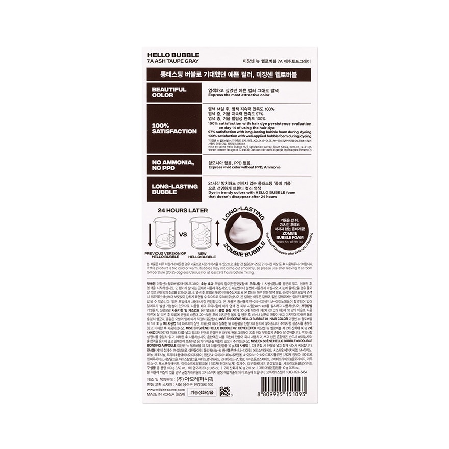 UNBELIEBUBBLE LONG LASTING COLOR Koreas No.1 HELLO BUBBLE hair colorant series has been upgraded Together with the new generation girl group — aespa, lets express the most attractive and vivid hair color, create the perfect hair style, and lead a new trend in hair dyeing. Presented in a total of 19 colors that contain the bright and bouncy charm of aespa by expanding the range of customer choices with a diverse color spectrum from toned-down to medium, vivid, and light. — New upgraded Zombie Bubble formula with finer and long-lasting bubble that doesnt disppear after 24 hours of foaming to revealing richer and more vivid trendy hair color. — 100% satisfaction with hair dye persistence evaluation after using the hair dye on day 14. — 97% satisfaction with long lasting bubble foam during dyeing. — 97% satisfaction with well applied bubble foam during dyeing. — Contains Double Bonding Ampoule to improve hair repair ability when dyeing. Maintain the smoothness and shinniness of hair. — No am.