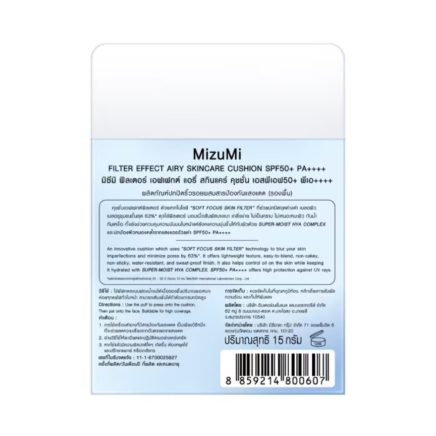 MizuMi Filter Effect Airy Skincare Cushion SPF50+ PA++++ Light is reflected and diffused for a natural looking, multi-dimensional, soft-blurred matte finish. It helps protect skin with broad spectrum SPF to defend against both UVA/UVB. cushion with 80 skincare ingredients amp; SPF. Cover imperfections, pores and bumps. Even out skin tecture. Instantly reduce shine and excess sebum with Moist Soft Matte finish. Promote long wear and 12 hours.Suitable for acne prone skin. Formulated 5 free from Silicone Free , Paraben Free Oil , Free Alcohol Free , Fragrance Free.Dermatologically Tested