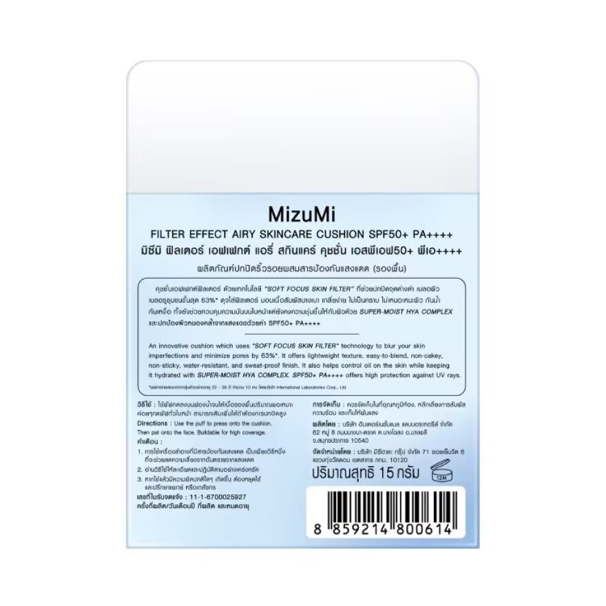 MizuMi Filter Effect Airy Skincare Cushion SPF50+ PA++++ Light is reflected and diffused for a natural looking, multi-dimensional, soft-blurred matte finish. It helps protect skin with broad spectrum SPF to defend against both UVA/UVB. cushion with 80 skincare ingredients amp; SPF. Cover imperfections, pores and bumps. Even out skin tecture. Instantly reduce shine and excess sebum with Moist Soft Matte finish. Promote long wear and 12 hours.Suitable for acne prone skin. Formulated 5 free from Silicone Free , Paraben Free Oil , Free Alcohol Free , Fragrance Free.Dermatologically Tested