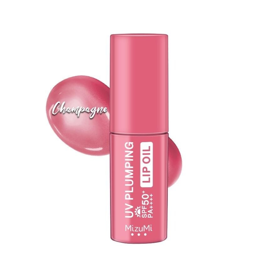 Mizumi Plumping Lip Oil Champagne SPF50+ PA++++ Immediately plumps lips, Anti-wrinkle on lips in 2 weeks, Moisturizes dry and chapped lips, Board spectrum protection. 6-Free Free Of Alcohol , Fragrance/Perfume, Paraben, Mineral Oil, Sulfate ,Silicone