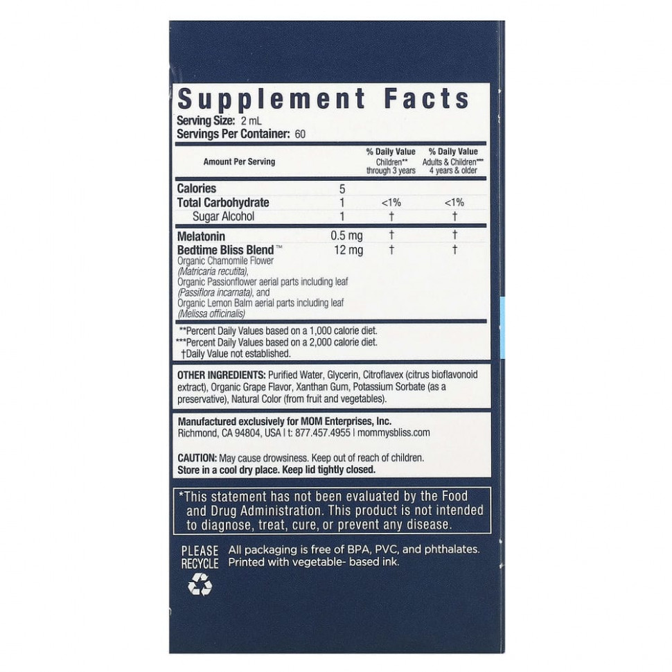 Средство для успокоения перед сном от Mommy’s Bliss: умиротворяющая смесь из экстрактов ромашки, мелиссы и пассифлоры для поддержания спокойствия.