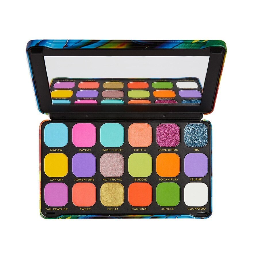 An 18-shade eyeshadow palette. Add the shades of paradise to your collection and brighten your looks with the Forever Flawless palette. With 18 colours inspired by tropical birds Revolutions palette includes a kaleidoscope of exotic hues. Featuring vibrant yellows sun drenched oranges and bright blues in matte and glitter formulas with intense luminous pigment payoff when applied with your finger. Hello year long summer Cruelty free Palette Includes Macaw A sky blue matte Vaycay A fuchsia pink matte Take Flight A sapphire blue matte Exotic A pinky orange matte Love Birds A fuchsia pink glitter Rio A blue glitter Canary A bright yellow matte Adventure A purple matte Hot Tropic A rose gold glitter Budgie A lime green matte Tocan Play A bright orange matte Island A lilac matte Tail Feather A lavender purple matte Tweet A coral pink matte Fiesta A gold glitter Cardinal A deep orange matte Jungle A bright green matte Cockatoo A white matte