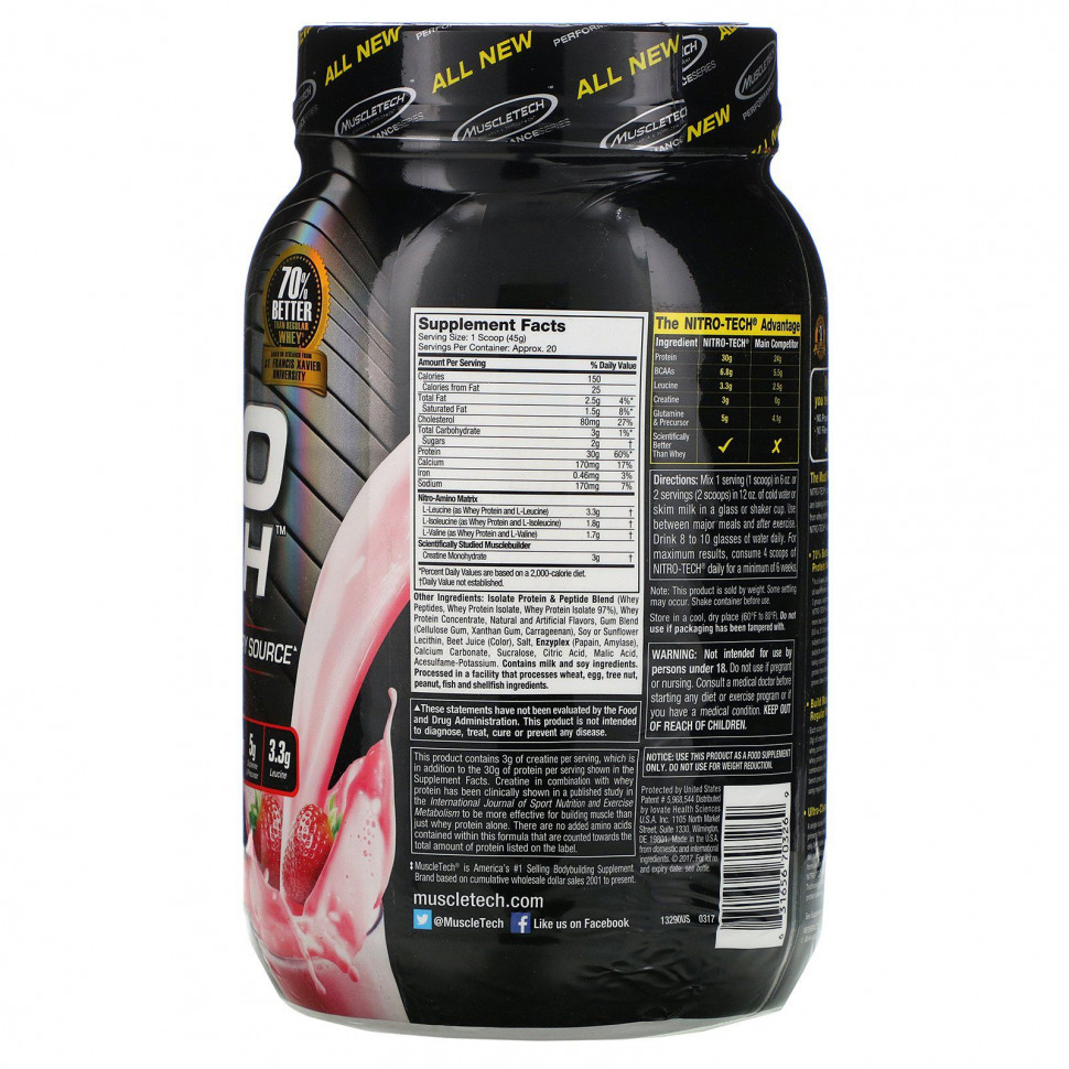 ? В результате 6-недельного двойного слепого исследования с участием 36 людей с опытом силовых тренировок не менее 3 лет, разделенных на 3 группы, участники, сочетающие силовые тренировки с приемом основных ингредиентов Nitro-Tech, набрали на 70% больше сухой мышечной массы, чем участники, использующие обычный сывороточный белок (8,8 фунта против 5,1 фунта) и улучшили результаты выполнения жима лежа по сравнению с участниками, использующими обычный сывороточный белок (34 фунта против 14 фунтов). Эти же участники набрали в 4 раза больше сухой мышечной массы, чем участники, использующие плацебо (8,8 фунта против 2,0 фунта). Этот препарат содержит 30 г ультрачистого белка. Кроме того, он предоставляет организму креатин в дозе, эффективность которой клинически доказана.