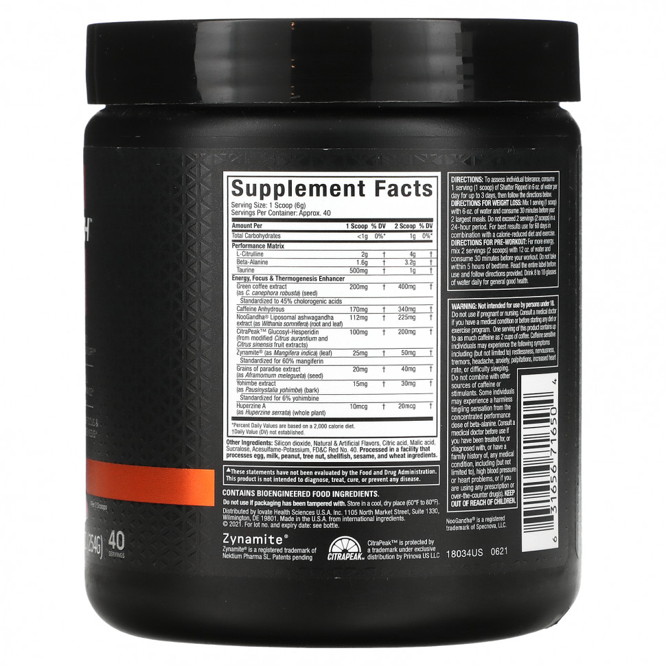 Shatter ™ Ripped для тех, кто отказывается принимать статус-кво. Эта превосходная гибридная формула 2-в-1 разработана с использованием самых популярных предтренировочных ингредиентов, а также экстракта C. canephora robusta — научно протестированного ингредиента для снижения веса, который поможет вам выглядеть и чувствовать себя наилучшим образом. Эта формула содержит точные дозы эффективных ингредиентов, включая зинамит® и L-цитруллин для повышения уровня оксида азота, а также кофеин для экстремальной энергии и повышения концентрации внимания. Он также содержит CitraPeak ™, научно изученную форму глюкозил-гесперидина премиального качества. Shatter Ripped поможет вам побить ваши личные рекорды.