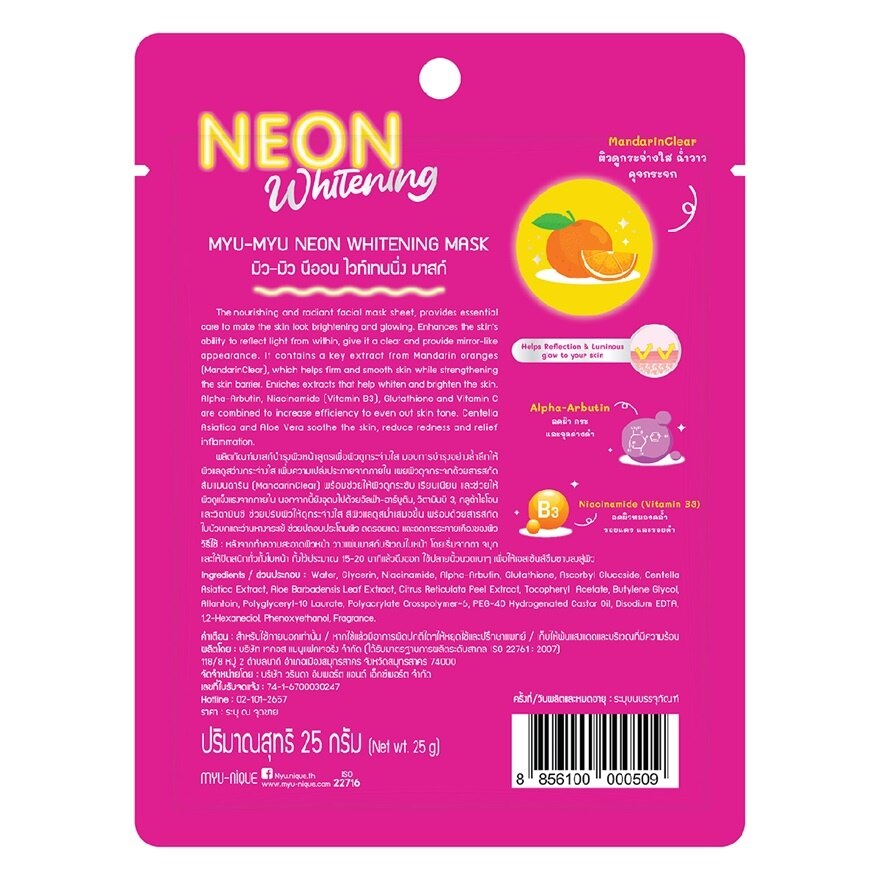 The nourishing and radiant facial mask sheet provides essential care to make the skin look brightening and glowing Enhances the skins ability to reflect light from within give it a clear and provide mirrorlike appearance It contains a key extract from Mandarin oranges MandarinClear which helps firm and smooth skin while strengthening the skin barrier Enriches extracts that help whiten and brighten the skin AlphaArbutin Niacinamide Vitamin B3 Glutathione and Vitamin C are combined to increase efficiency to even out skin tone Centella Asiatica and Aloe Vera soothe the skin reduce redness and relief inflammation.