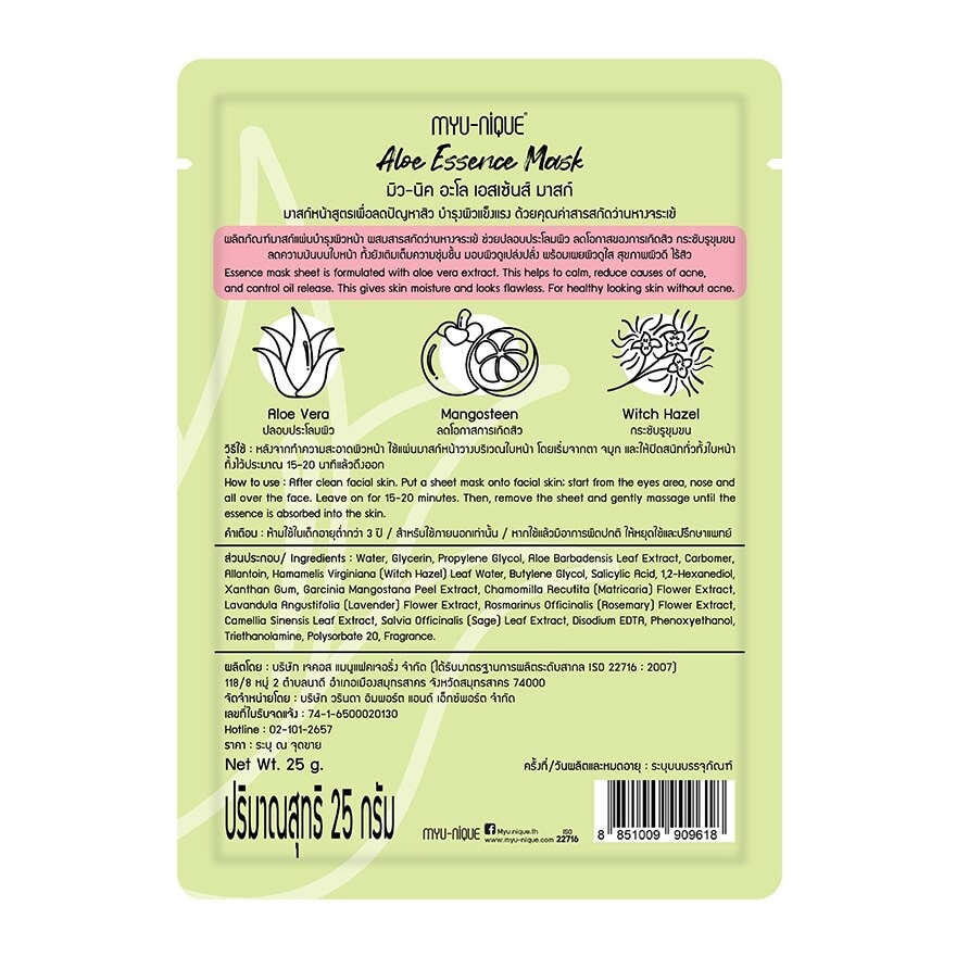 Myu-Nique Aloe Essence Mask A tencel facial mask sheet with light, non-sticky and intensive essence formulation. This essence mask sheet is formulated with Aloe vera extract; helps to rejuvenate skin damaged from sunlight and pollution, reduces causes of acne and give skin moisturizing effect. Mangosteen extract helps to ruduce causes of acne and anti-irritation. And Witch Hazel extract acts as pore minimizer and facial oil control. This essence facial mask sheet gives your skin moisture and looks flawless. For healthy looking skin without acne.