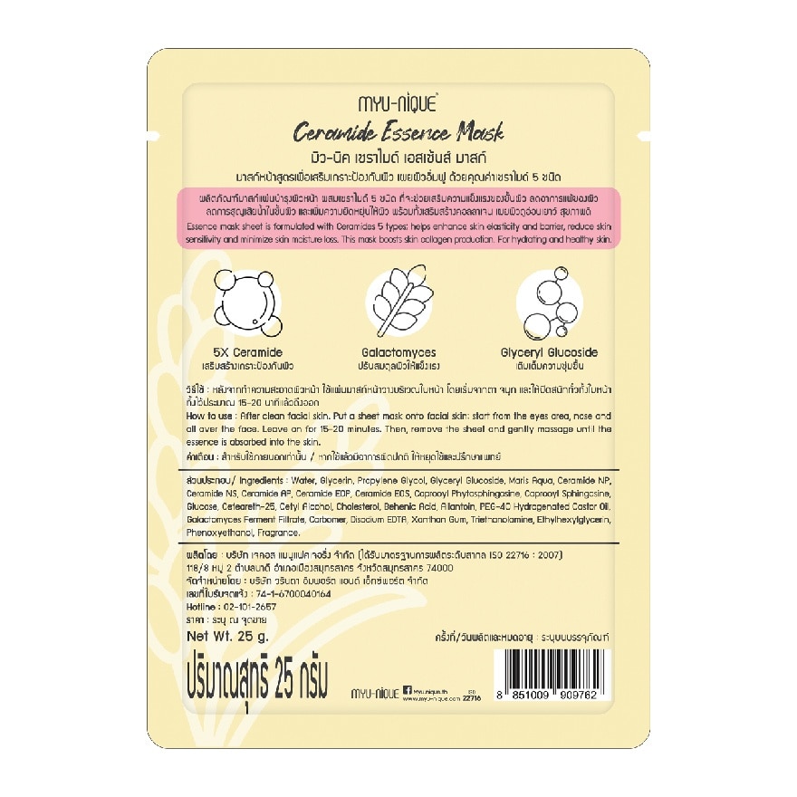 Myu-Nique Ceramide Essence Mask Facial mask sheet with great quality result essence is formulated with Ceramides 5 types helps enhance skin elasticity and barrier, reduce skin sensitivity, and minimize skin moisture loss. This mask boosts skin collagen production, For hydrating and healthy skin. After clean facial skin. Put a sheet mask onto facial skin start from the eyes area, nose and all over the face. Leave on for 15-20 minutes. Then, remove the sheet and gently massage until the essence is absorbed into the skin. Myu-Nique Ceramide Essence Mask Facial mask sheet with great quality result essence is formulated with Ceramides 5 types helps enhance skin elasticity and barrier, reduce skin sensitivity, and minimize skin moisture loss. This mask boosts skin collagen production, For hydrating and healthy skin.