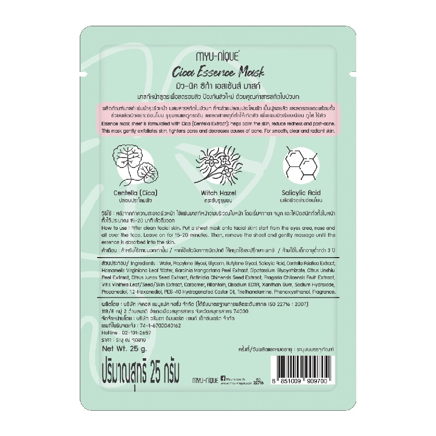 Myu-Nique Cica Essence Mask Facial mask sheet with great quality result essence is formulated with Cica (Centella Extract) helps calm the skin, reduce redness and post-acne. This mask gently exfoliates skin, tightens pores and decreases causes of acne. For smooth, clear and radiant skin. After clean facial skin. Put a sheet mask onto facial skin start from the eyes area, nose and all over the face. Leave on for 15-20 minutes. Then, remove the sheet and gently massage until the essence is absorbed into the skin. Myu-Nique Cica Essence Mask Facial mask sheet with great quality result essence is formulated with Cica (Centella Extract) helps calm the skin, reduce redness and post-acne. This mask gently exfoliates skin, tightens pores and decreases causes of acne. For smooth, clear and radiant skin.