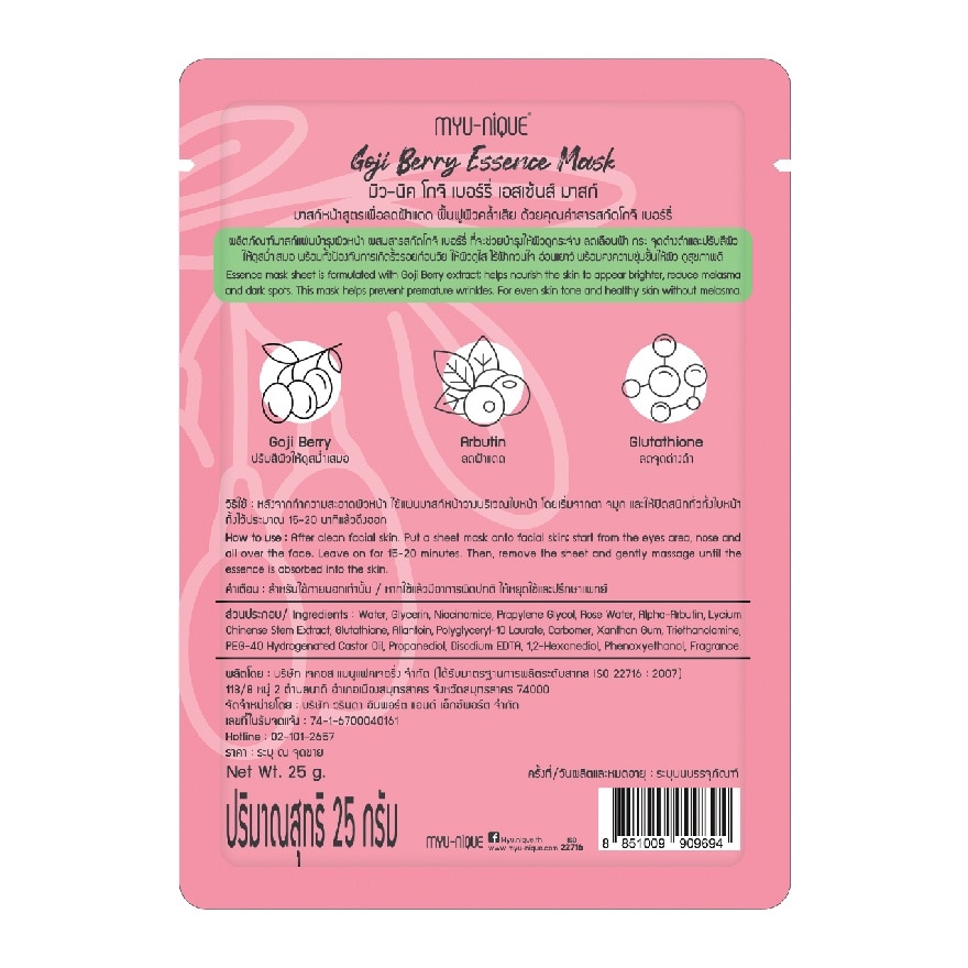 Myu-Nique Goji Berry Essence Mask Facial mask sheet with great quality result essence is formulated with Goji Berry extract helps nourish the skin to appear brighter, reduce melasma and dark spots. This mask helps prevent premature wrinkles. For even skin tone and healthy skin without melasma. After clean facial skin. Put a sheet mask onto facial skin start from the eyes area, nose and all over the face. Leave on for 15-20 minutes. Then, remove the sheet and gently massage until the essence is absorbed into the skin. Myu-Nique Goji Berry Essence Mask Facial mask sheet with great quality result essence is formulated with Goji Berry extract helps nourish the skin to appear brighter, reduce melasma and dark spots. This mask helps prevent premature wrinkles. For even skin tone and healthy skin without melasma.