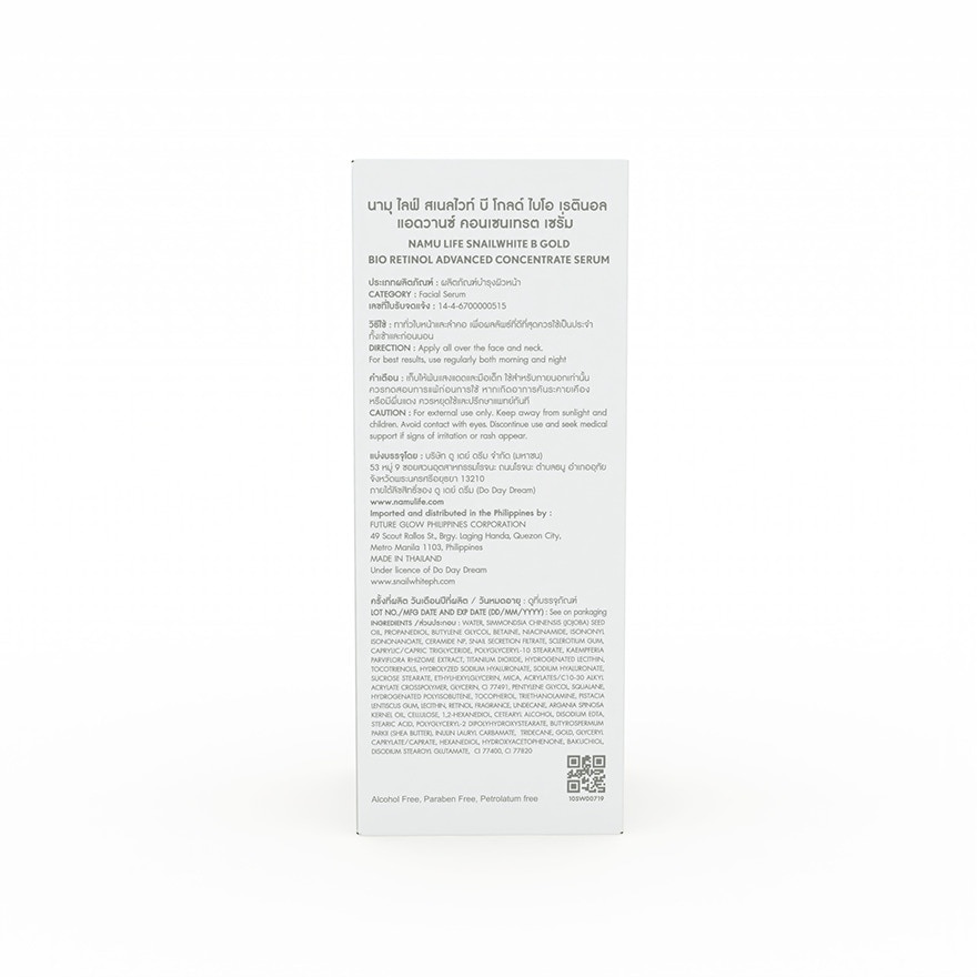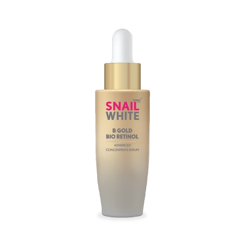 NAMU LIFE SNAILWHITE B GOLD BIO RETINOL ADVANCED CONCENTRATE SERUM Innvation youthful skin radiant with Snailwhite B Gold Bio Retinol Advanced Concentrate Serum. This highly effective wrinkle-reducing serum features a special formula with Natural Extract Retinol and B Gold that helps rejuvenate your skin,revealing a smooth and firm appearance. Infused with Gold Flakes, it nourishes aging skin, togethe with Niacinamide which helps reduce dark spots.Ultimately,Snail Mucin Extract and Encapsulation Ceramide-3 help regain hyaration and lock imn moisture, preventing moisture loss.Unlock radiant,healthy, and youthful skin with this luxurious serum — B GOLD -Natural Retinol -Encapsulation Ceramide-3 -NanOil -Niacinamide (Vitamin B3) -Gold 98.5%