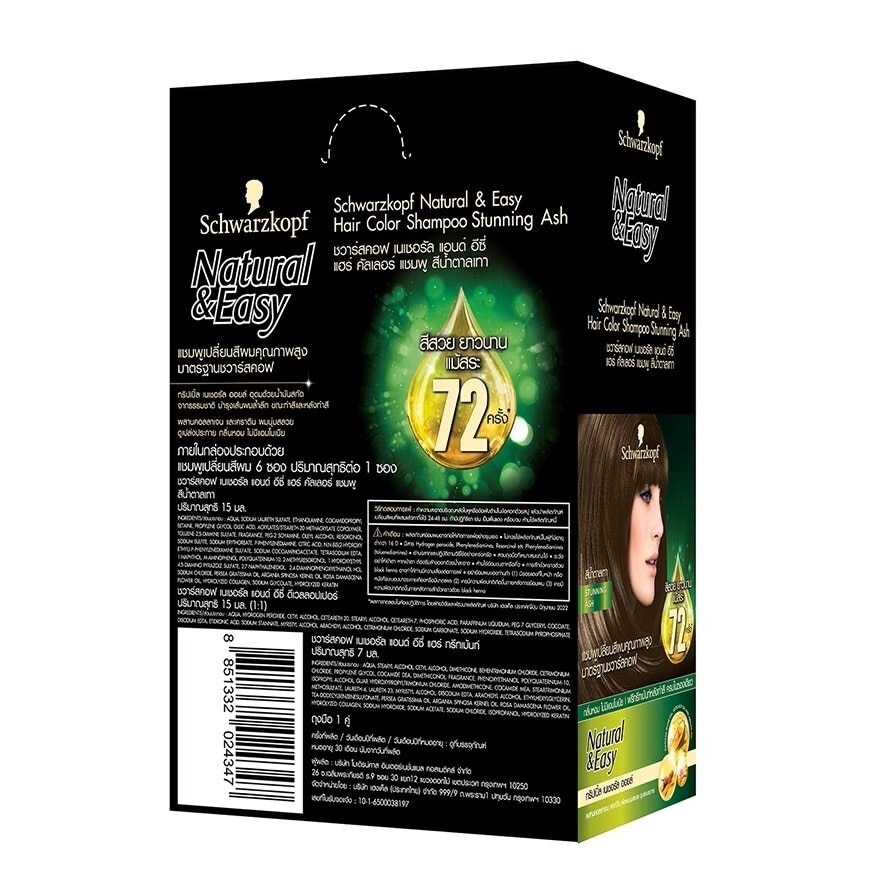 Schwarzkopf Natural & Easy Hair Color Shampoo Stunnin Ash Color Fully cover your grey hair and nourish with triple natural oil formula together with collagen and keratin for smooth ans hiny hair. The product has no ammonia and can cover your grey hair last long up to 18 weeks. Usage Information Mix 2 side of the product sachet well before apply on dry or almost dry hair especially on the area with grey hair. Leave for 10-15 mins. You can leave it longer if you have a lot of grey hair. Rinse off and apply treatment. Leave for 5 mins and rinse off. Instrumental test , average number of washes 4x/week by Henkel R&D Japan, June 2022,